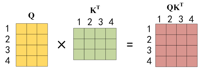 公式中计算矩阵Q和K每一行向量的内积,为了防止内积过大,因此除以 \(d_k\) 的平方根。Q乘以K的转置后,得到的矩阵行列数都为 n,n 为句子单词数,这个矩阵可以表示单词之间的 attention 强度。下图为Q乘以 \(K^T\) ,1234 表示的是句子中的单词。