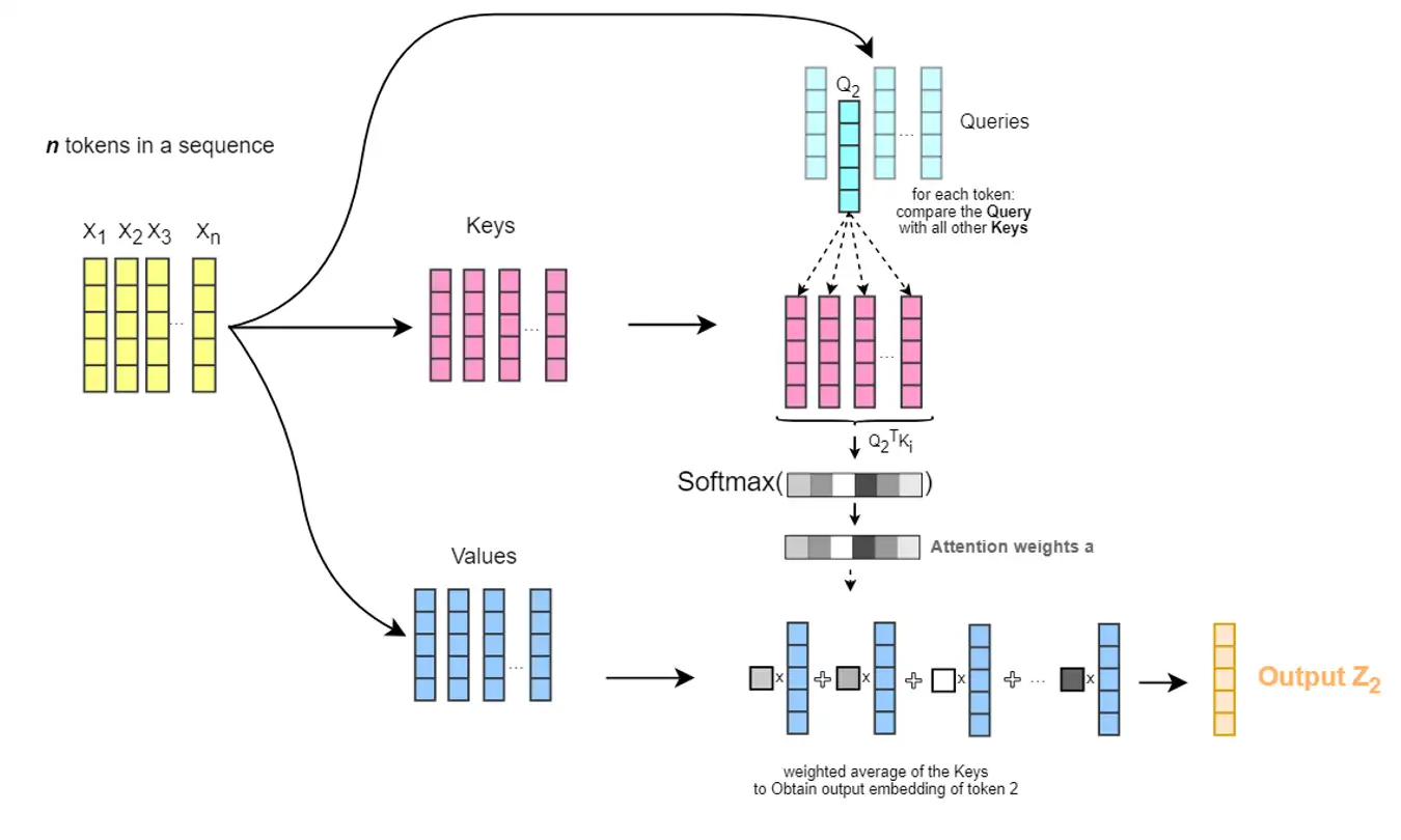 Self-Attention 在计算的时候需要用到矩阵Q(查询),K(键值),V(值)