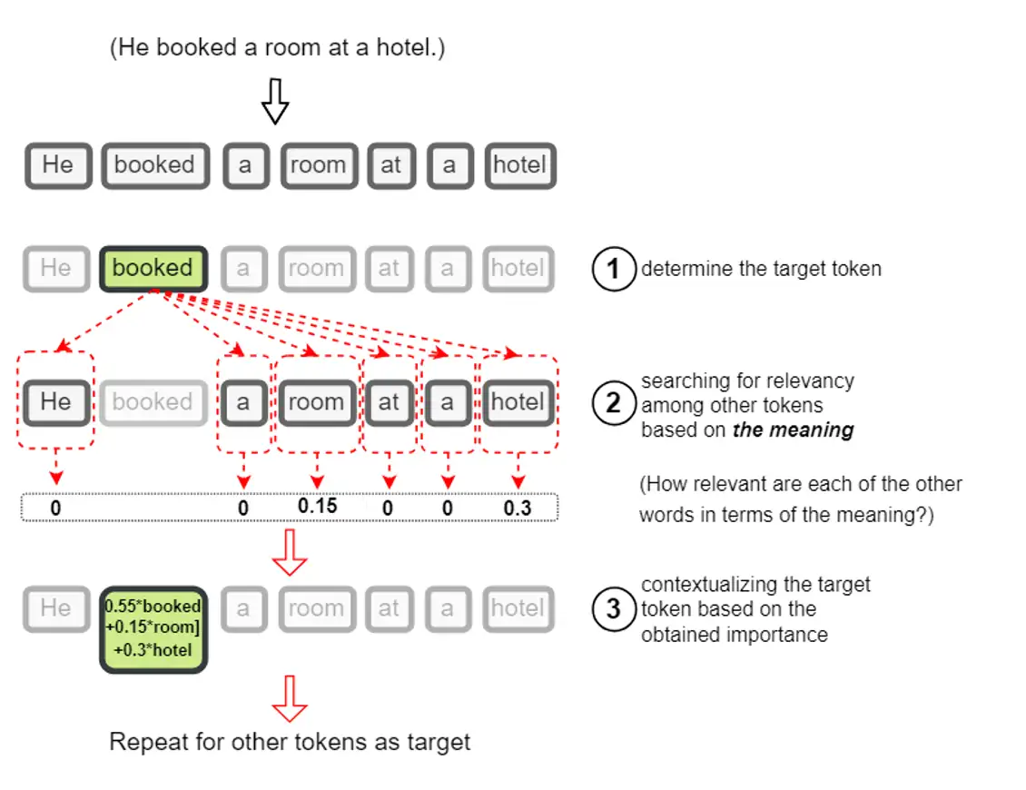 比如这样一句话:“He booked a room at a hotel.”。我们对其中“booked”这个单词(实际上是 token)做 Attention 机制。“booked”会对“He booked a room at a hotel.”这句话中所有的 token ,包括“booked”自己,都做一遍点乘,然后做 Softmax 。再然后,Softmax 后的结果与“He booked a room at a hotel.”转换成的 V 向量相乘,得到加权后的变换结果:0.55*booked+0.15*room+0.3*hotel=booked,即“booked”这个单词可以用“0.55*booked+0.15*room+0.3*hotel” 这样一个复杂的单词来表示(把“0.55*booked+0.15*room+0.3*hotel”想象成一个单词,便能轻松理解这样表示的意义),见下图: