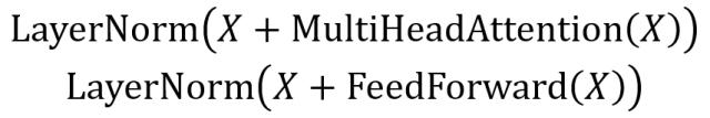 其中 X表示 Multi-Head Attention 或者 Feed Forward 的输入,MultiHeadAttention(X) 和 FeedForward(X) 表示输出 (输出与输入 X 维度是一样的,所以可以相加)。