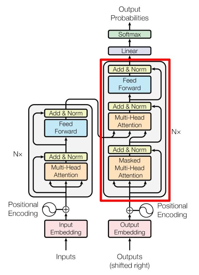 这就是 Decoder block 的定义,与 Encoder 一样,Decoder 是由多个 Decoder block 组合而成。