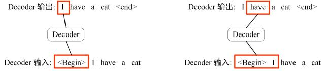 上图 Decoder 接收了 Encoder 的编码矩阵 C,然后首先输入一个翻译开始符 “<Begin>",预测第一个单词 “I”;然后输入翻译开始符 “<Begin>” 和单词 “I”,预测单词 “have”,以此类推。