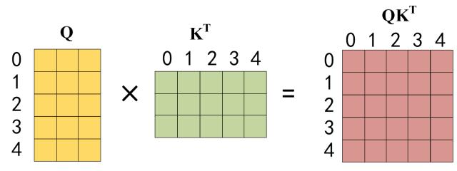 - 第二步:接下来的操作和之前的 Self-Attention 一样,通过输入矩阵X计算得到Q,K,V矩阵。然后计算Q和 K^T 的乘积 QK^T