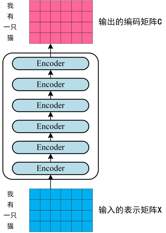 将得到的单词表示向量矩阵 (如上图所示,每一行是一个单词的表示 x) 传入 Encoder 中,经过 6 个 Encoder block 后可以得到句子所有单词的编码信息矩阵 C,如下图。单词向量矩阵用\(\mathbf{X}_{n \times d}\)表示, n 是句子中单词个数,d 是表示向量的维度 (论文中 d=512)。每一个 Encoder block 输出的矩阵维度与输入完全一致。