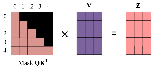 - 第四步:使用 Mask QK^T 与矩阵 V相乘,得到输出 Z,则单词 1 的输出向量 是只包含单词 1 信息的。